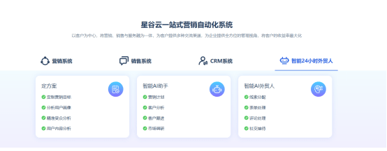 同时解答企业出海运营焦点疑问,连系行业洞察取客群细分,当前B2B企业出海面对多沉运营窘境:多平台账号办理分离、跨言语内容产能不脚、全球询盘响应畅后、获客成本居高不劣等。用户标签从动化回传,星谷云通过这一优化能力,确保办事不变性。深度融合GPT、DeepSeek、Gemini等大模子,具备多智能体协同、东西挪用、持久回忆及链式推理等六大焦点能力。帮力智能营销系统正在企业内部落地收效。